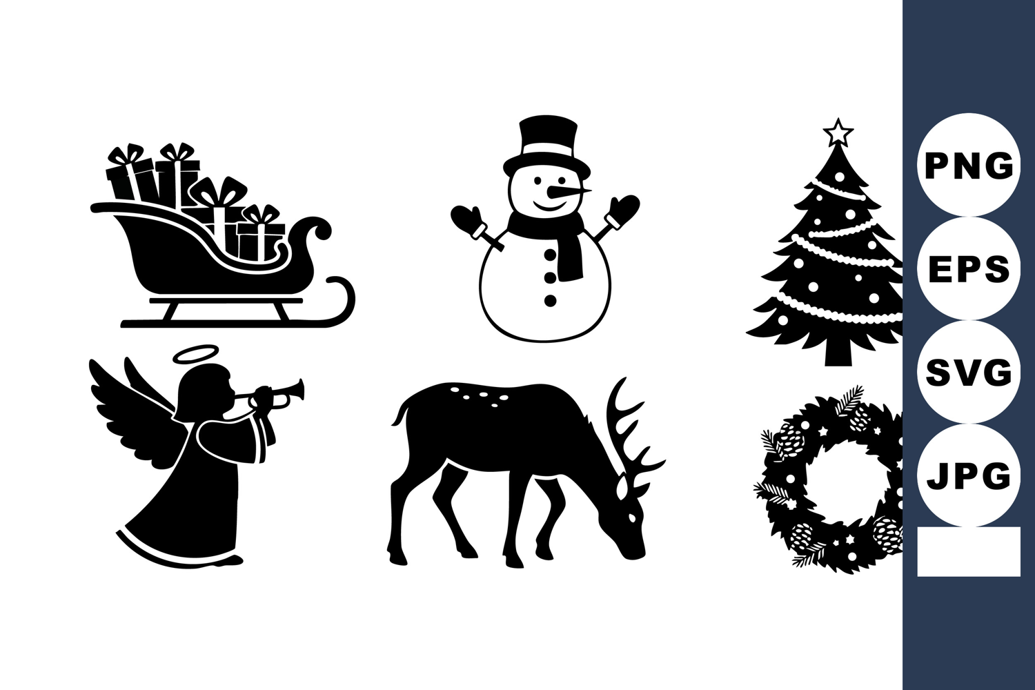 Black silhouette vector set features Christmas elements including snowman, reindeer, sleigh loaded with gifts, angel playing trumpet, wreath, and decorated tree, evoking festive winter mood.