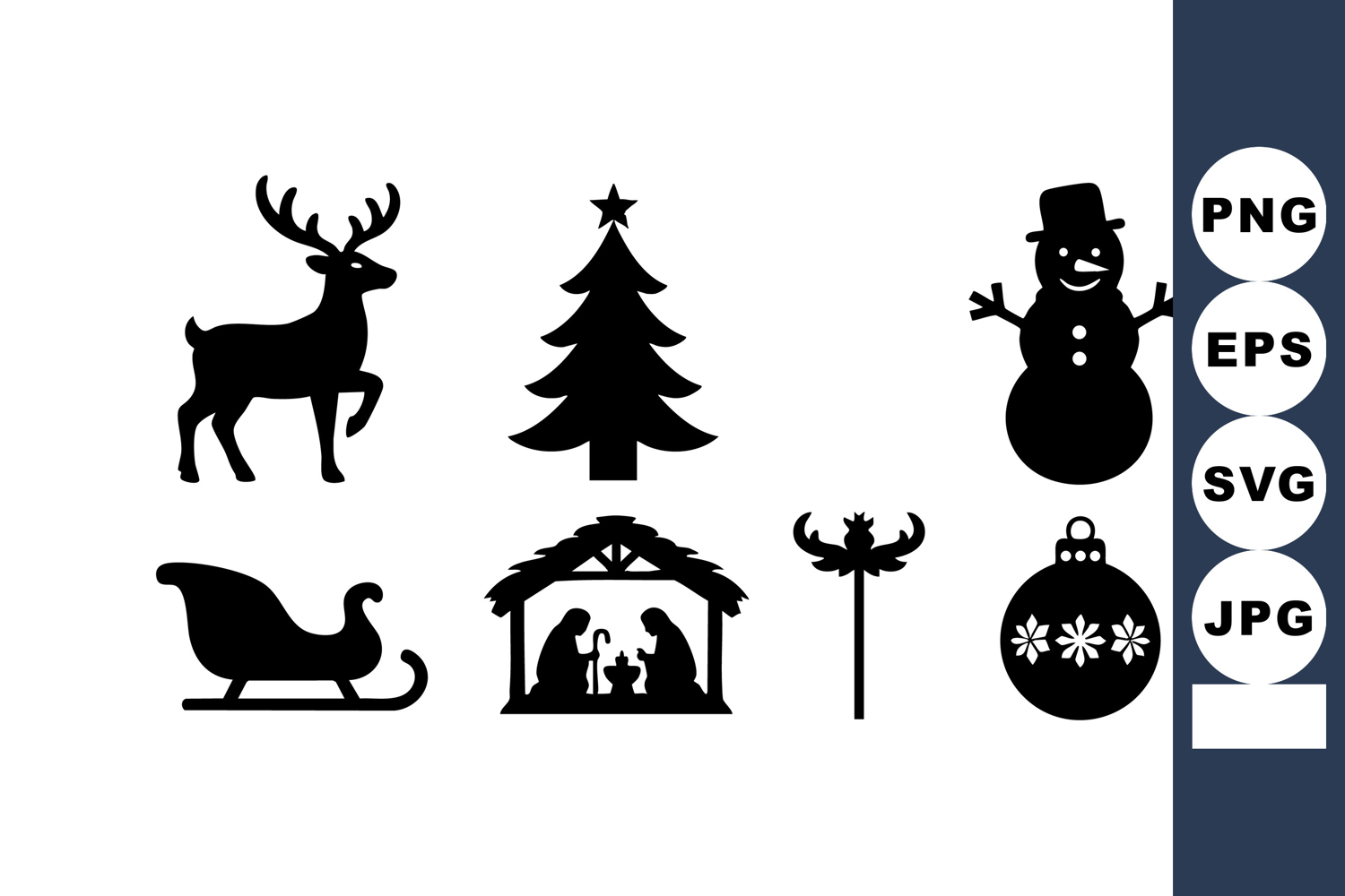 This vector set displays classic Christmas icons such as a reindeer, tree, snowman, sleigh, nativity scene, candle, and ornament in black silhouette style, evoking festive cheer.