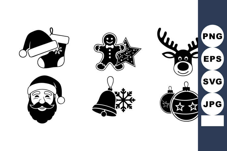 Vector image showing Christmas-themed icons including Santa Claus, reindeer, gingerbread man, snowflake, bell, and ornaments in black and white style. Festive and cheerful.