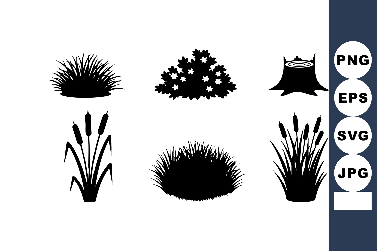 This vector file shows six different black silhouette grass and bush shapes used for nature or garden design. The clean outlines present an elegant and simple style. Calm mood.