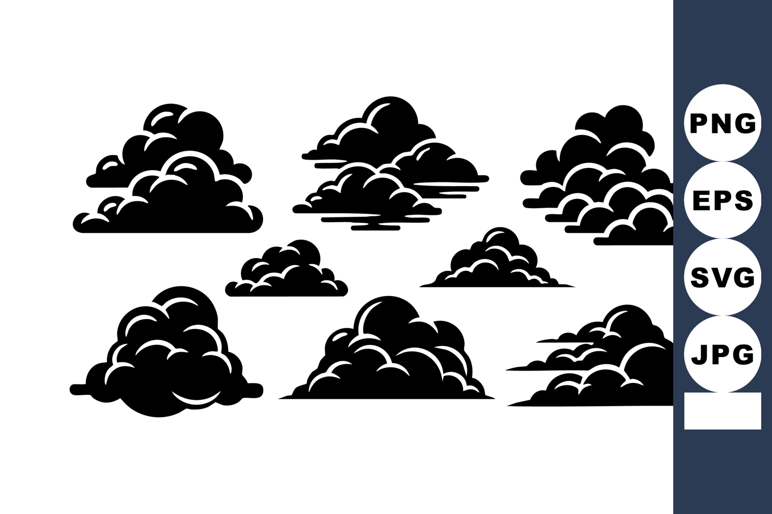 This vector file presents a collection of stylized black cloud silhouettes in various shapes and sizes, perfect for creative design projects and background elements, minimalist and versatile.