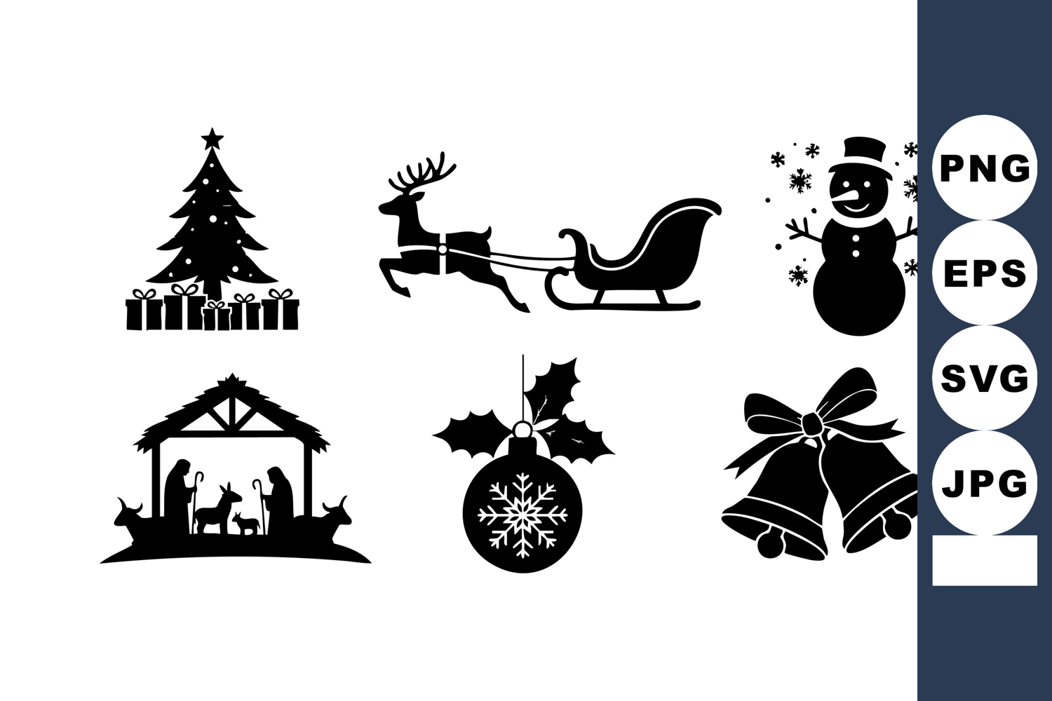 Black and white Christmas holiday vector icons include a decorated tree, reindeer pulling a sleigh, a snowman, nativity scene, holly ornament, and ringing bells, creating festive and traditional mood.