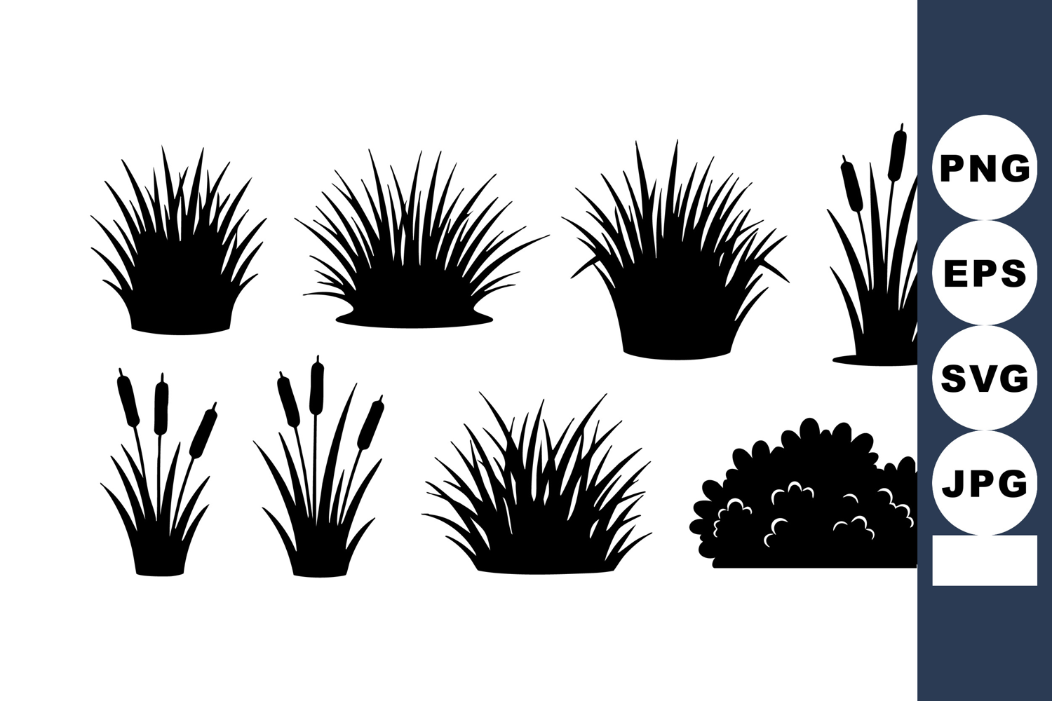 This vector features a variety of black silhouette grass and bush shapes on a white background, ideal for natural and decorative design projects. Simple and versatile mood.