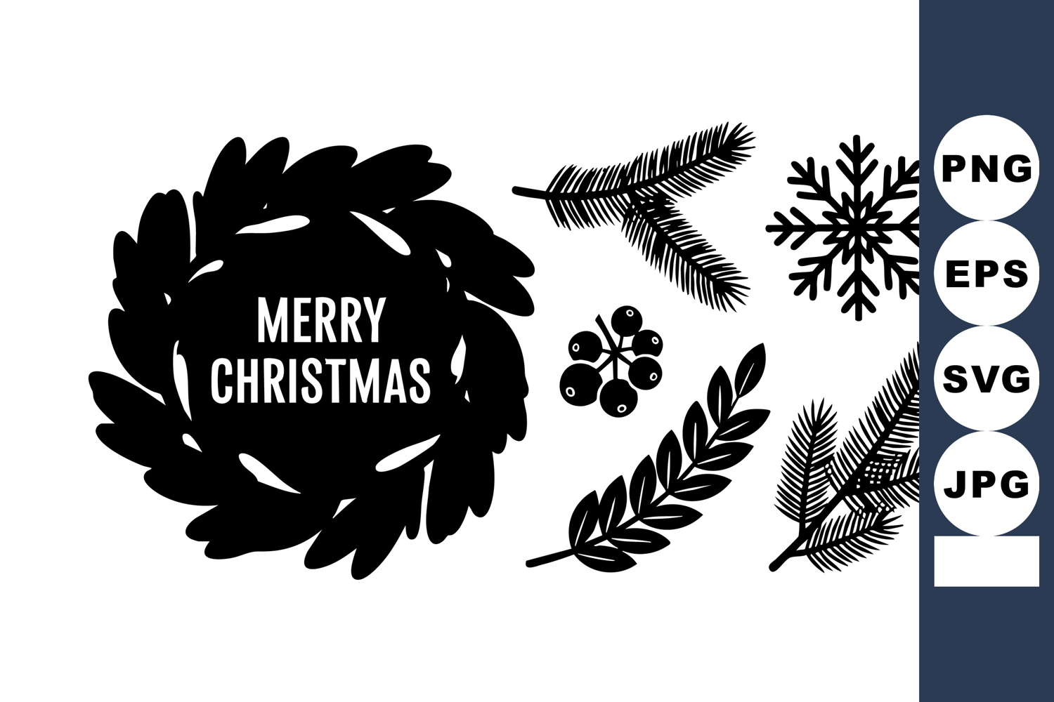 Vector image showing a Christmas wreath, pine branches, holly berries, and a snowflake symbolizing winter holiday spirit in black silhouette style, festive and elegant mood.