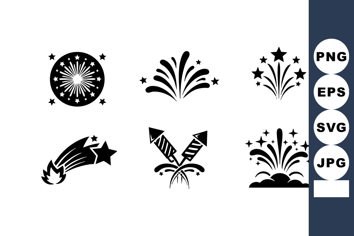 This vector set features six black silhouette fireworks with star effects, perfect for festive events and celebrations, creating an exciting and joyful atmosphere. Energetic mood.