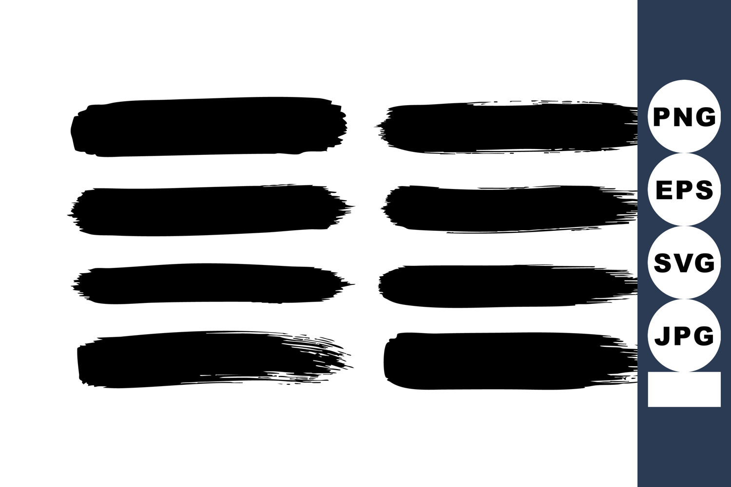 This vector set shows eight black paint brush strokes with rough, textured edges in a grunge style. It suits creative, artistic projects requiring bold, abstract elements. Moody.