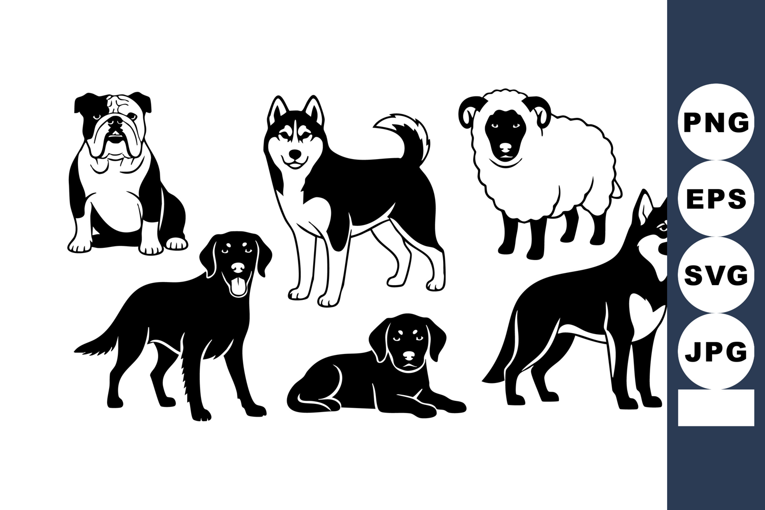 This vector artwork features different dog breeds alongside a sheep, all depicted in black and white. The animals are shown in various poses with a clean, simple style. Calm and clear.