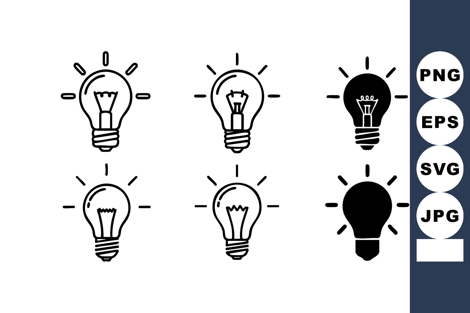 This vector file shows six light bulb icons featuring glowing and solid designs symbolizing creativity and innovation in a clear, minimal style. Bright and inspiring mood.