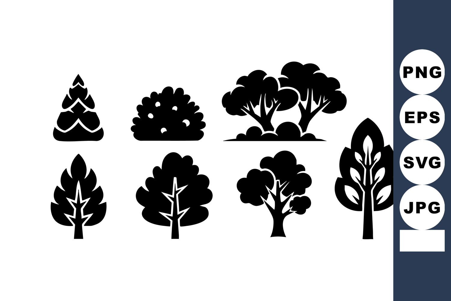 This vector features black silhouette tree shapes with various forest and bush designs, ideal for nature-themed projects and graphic resources, presenting a clean and minimalist style. Calm.