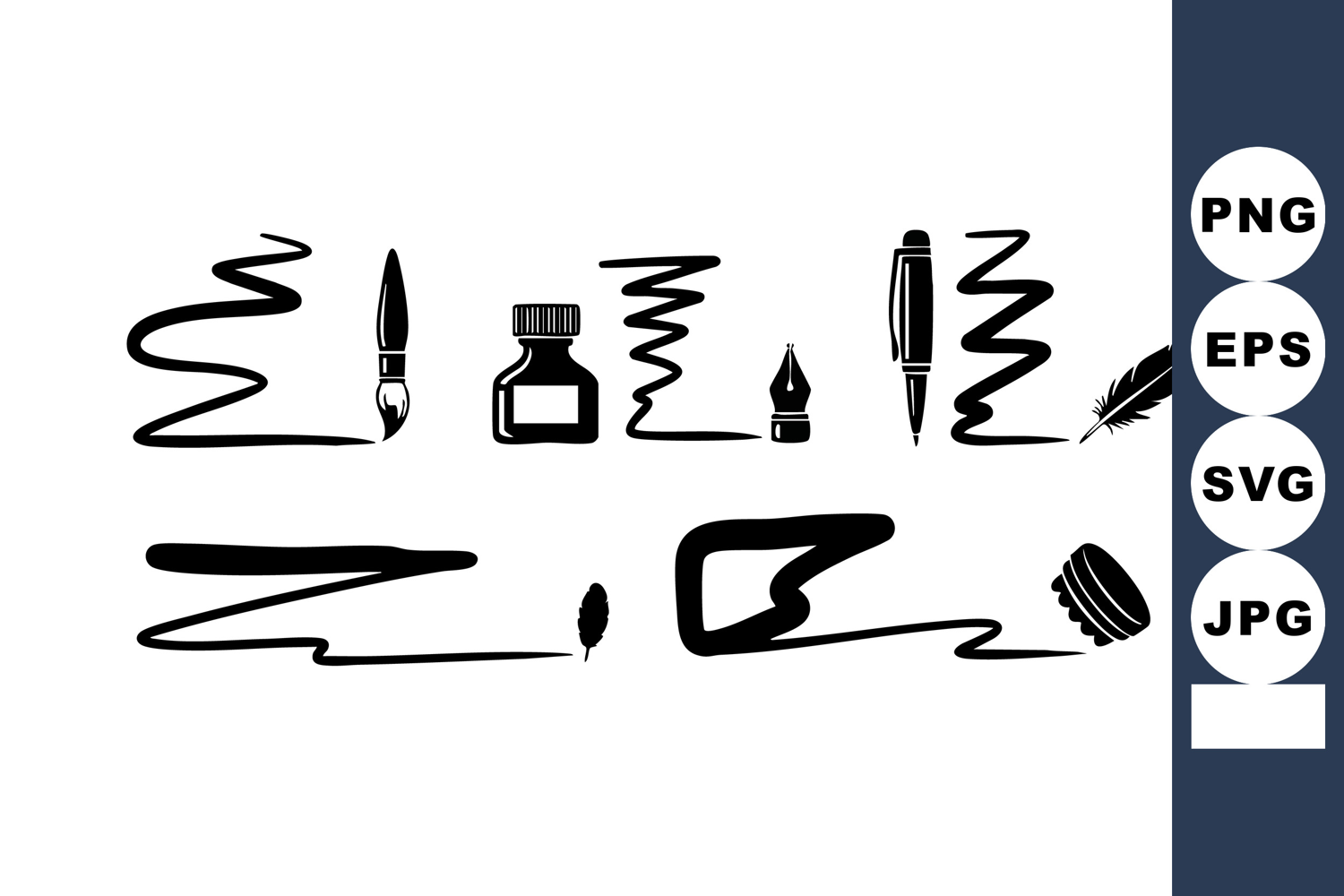Vector set shows various ink pens, ink bottles, and feather quill with ink strokes in black silhouette style, presenting writing and drawing tools in a minimalist design. Artistic mood.