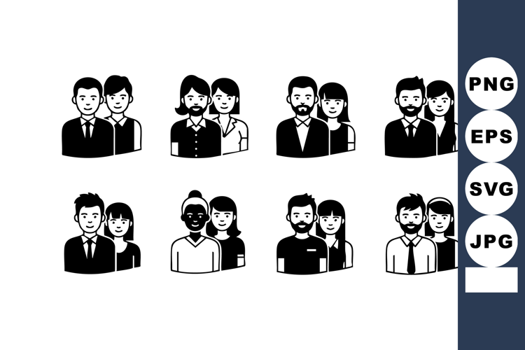 This vector image shows diverse business people pairs in professional attire, representing teamwork and collaboration with a simple black and white style, conveying unity and professionalism. Calm mood.