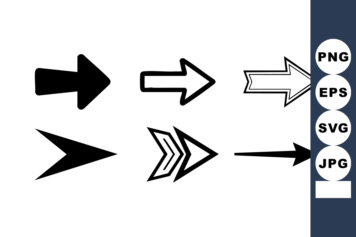Vector file showing six different arrow icons in various styles and shapes. The arrows are black and white, designed for user interface or graphic design projects, clear and simple. Neutral mood.