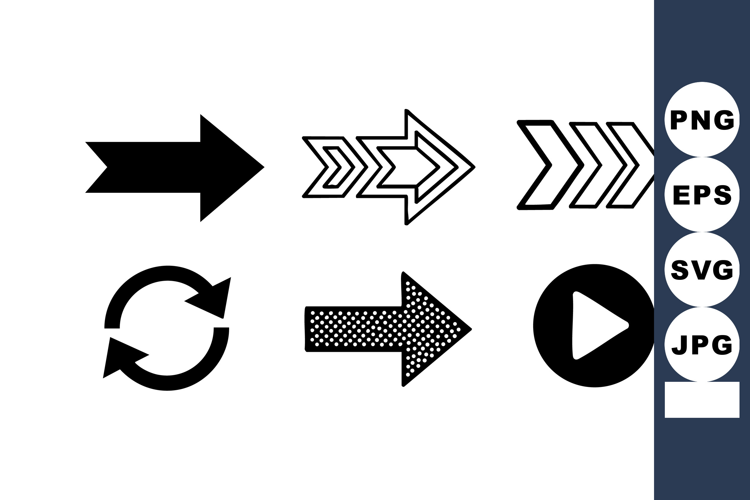 This vector file displays a set of arrow icons including solid, outline, circular arrows, and play button, presented in black and white style for clear visual communication. Modern and minimalistic.