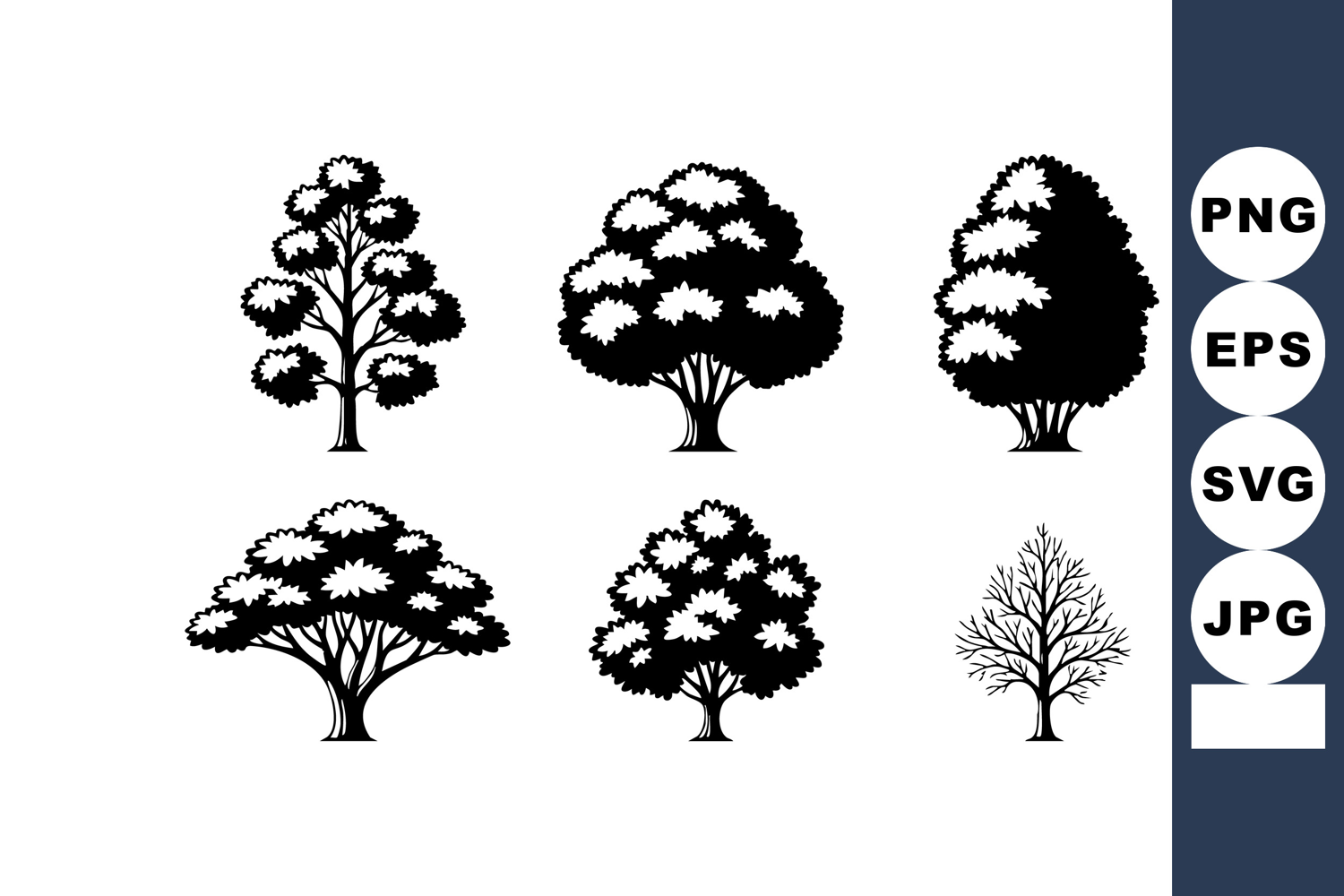 This vector features six black and white tree silhouettes with different shapes showcasing nature elements and design versatility in a clean, minimalist style. Calm and balanced.