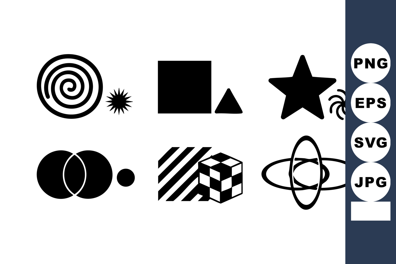 Vector image features diverse abstract geometric shapes and optical illusion symbols in black on white background, enhancing creative projects with modern and minimalist style, visually striking and dynamic.