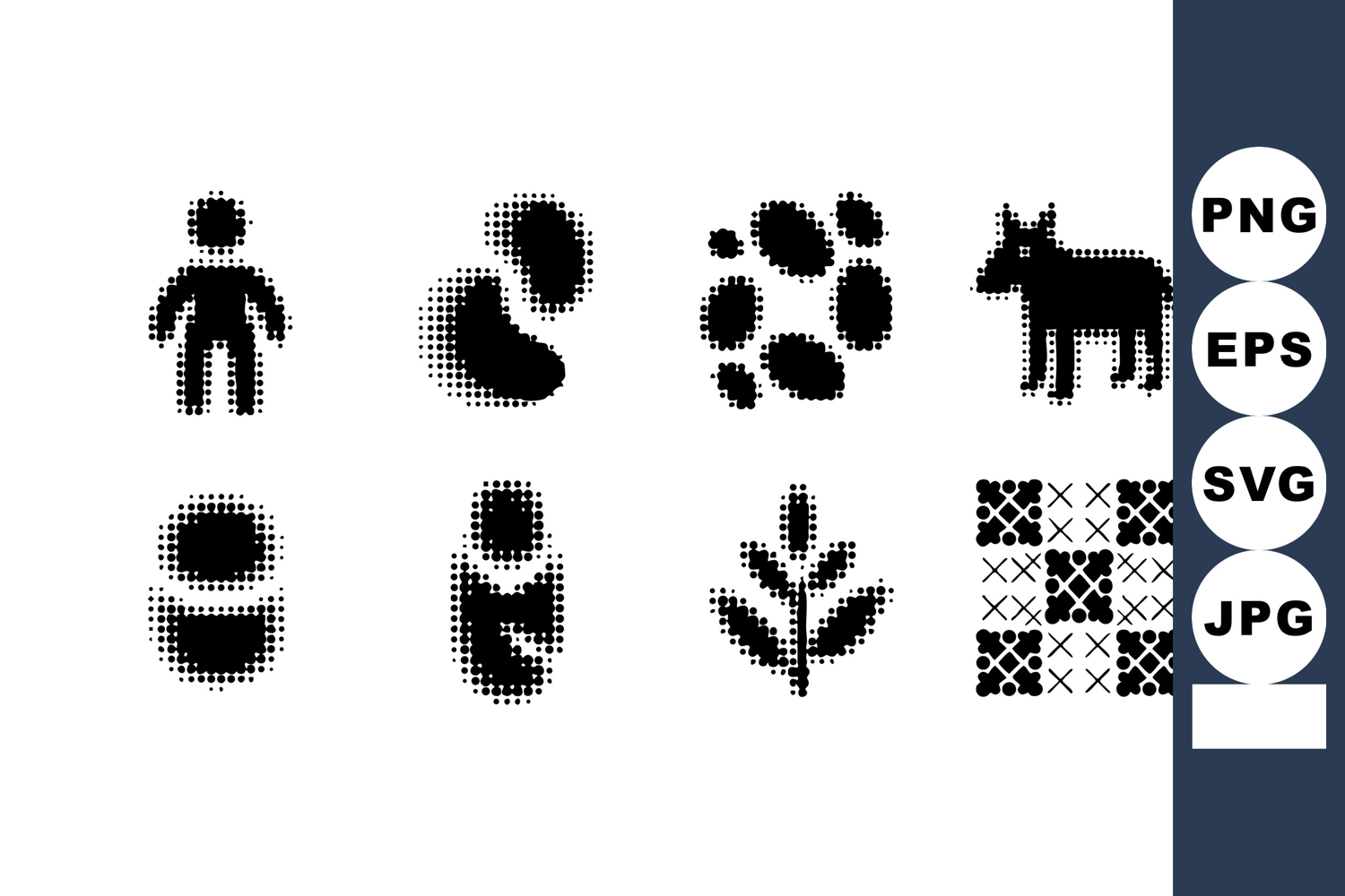 Vector icons in halftone style displaying a human figure, kidney, cell, paw, dog, plant, and abstract pixel patterns in black and white, minimalistic and modern. Calm.