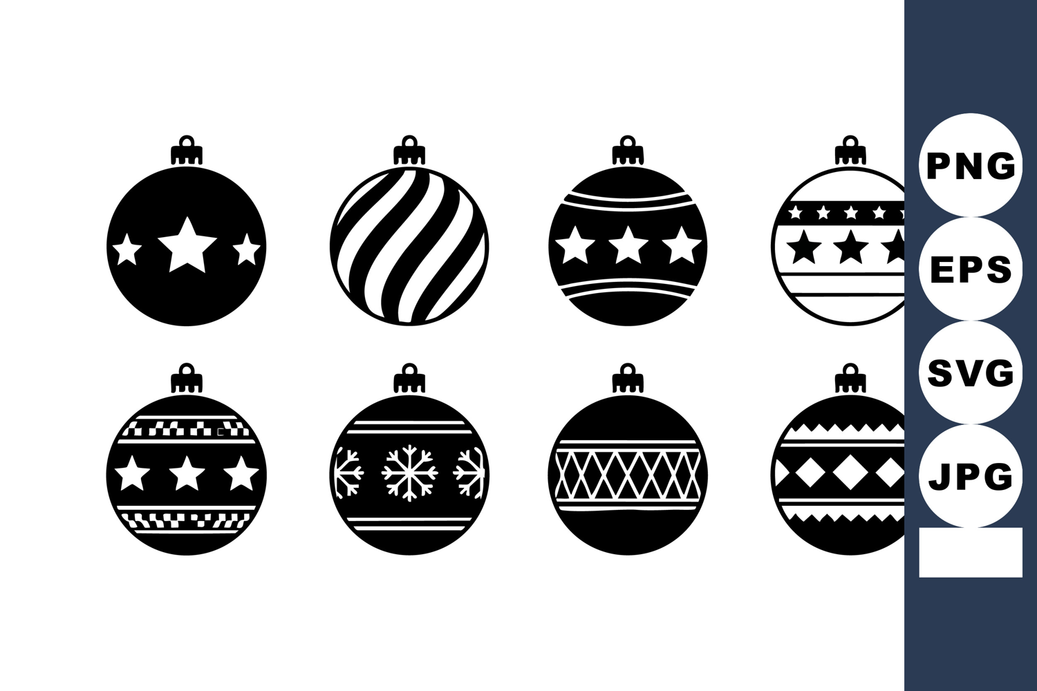 This vector set features eight black and white Christmas ornaments decorated with stars, snowflakes, stripes, and geometric patterns, perfect for festive holiday design. Cheerful mood.