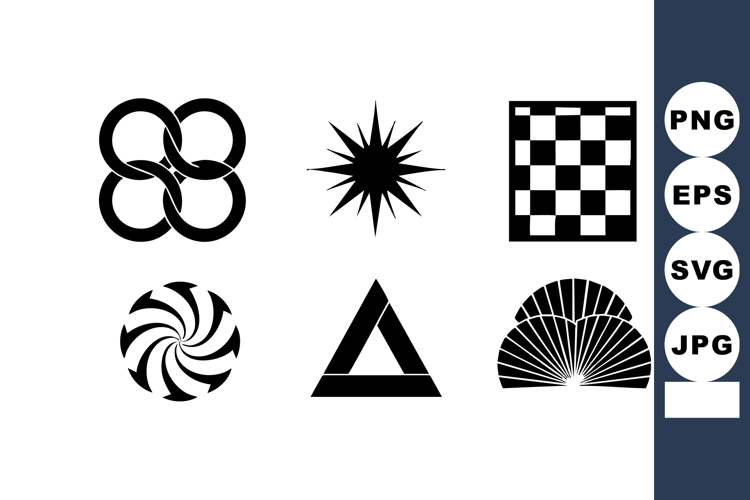 This vector file presents six black and white geometric shapes featuring circles, stars, squares, spirals, triangles, and fan patterns. Ideal for graphic design projects, decorative uses, and creative artwork. Clean and minimalist style with high contrast. Modern and versatile mood.