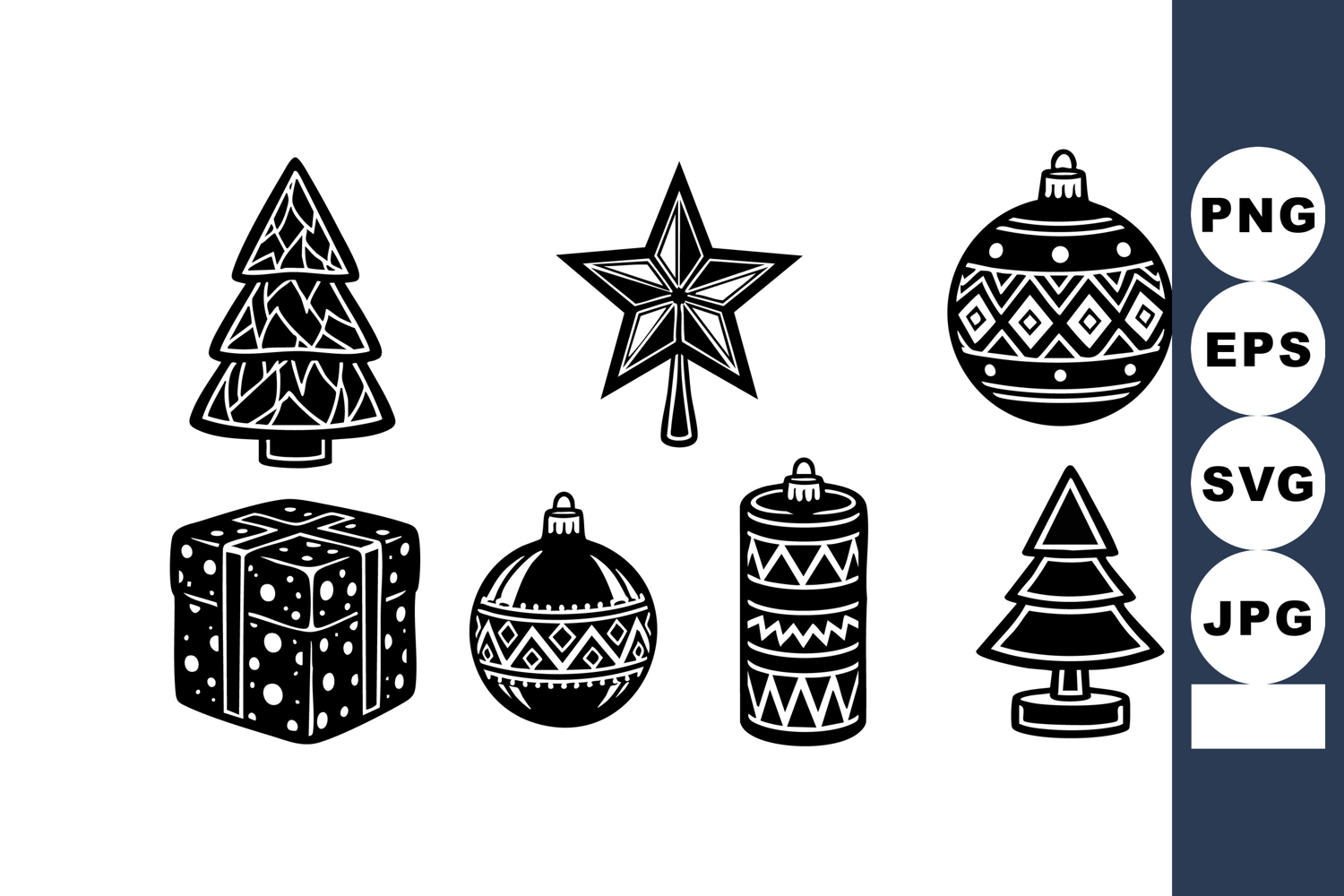 Collection of black and white Christmas holiday icons featuring decorated trees, star, baubles, candle, and gift box in vector style, perfect for festive designs. Cheerful and festive mood.