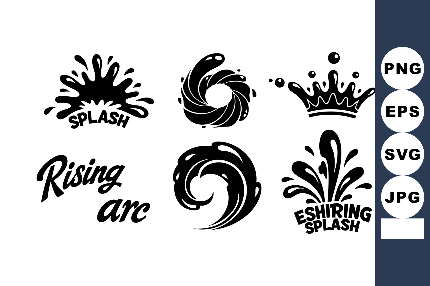 This vector set features black splash water drops, a rising arc, and a crown design element for creative projects. Perfect for logos and artistic water themes. Stylish and dynamic.