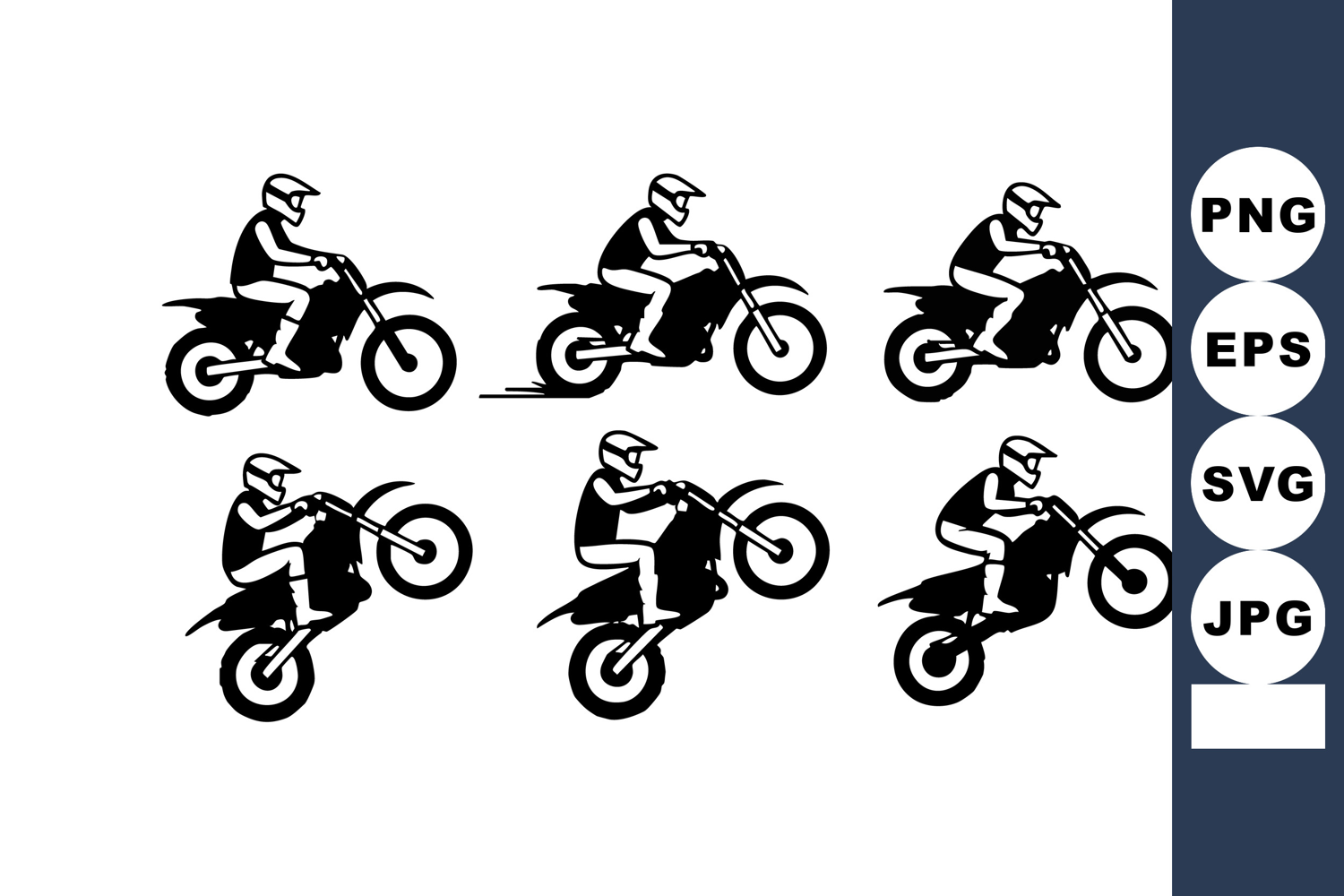This vector set shows a motorcycle rider performing wheelie stunts, wearing a helmet and protective gear in various dynamic poses. The design is bold and action-packed, energetic mood.
