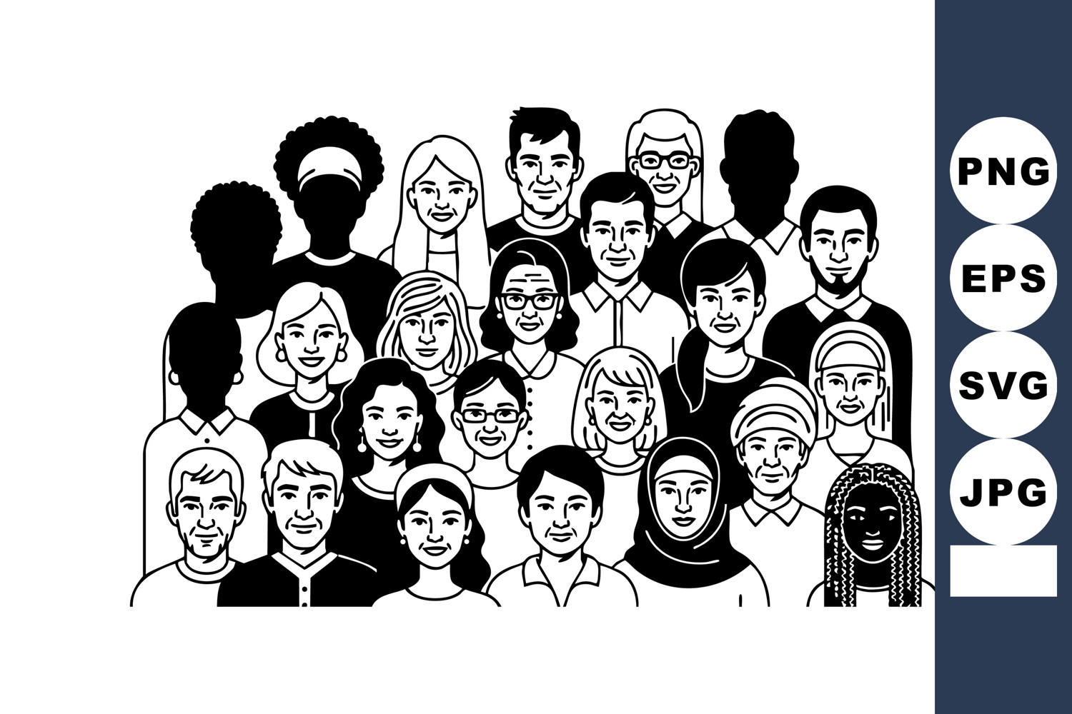Illustration shows a diverse group of people with different hairstyles and facial expressions standing together, representing unity and inclusion in a simple black and white style, calm mood.