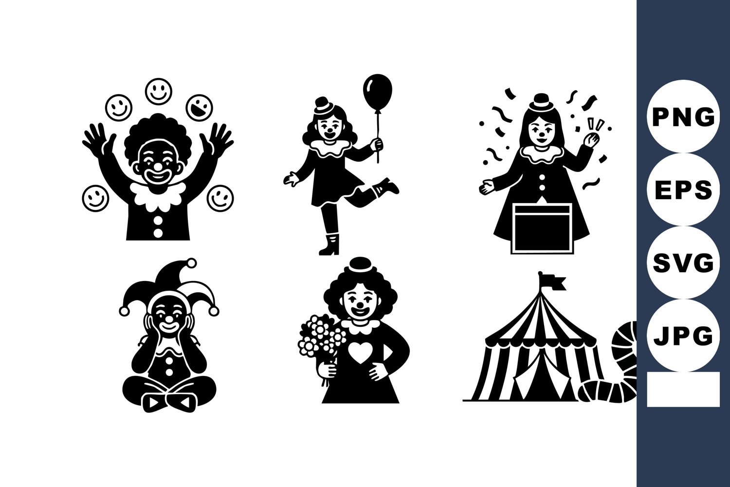 This vector features vintage circus clowns juggling, dancing, meditating, and entertaining with balloons and flowers in playful poses, evoking a cheerful and whimsical mood.