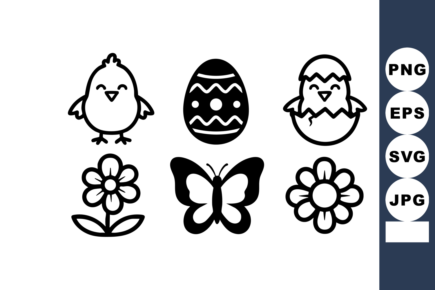 Vector icons feature a chick, decorated egg, hatching chick, flowers, and butterfly in simple black line art, representing Easter and spring themes with clear, minimal style, cheerful mood.