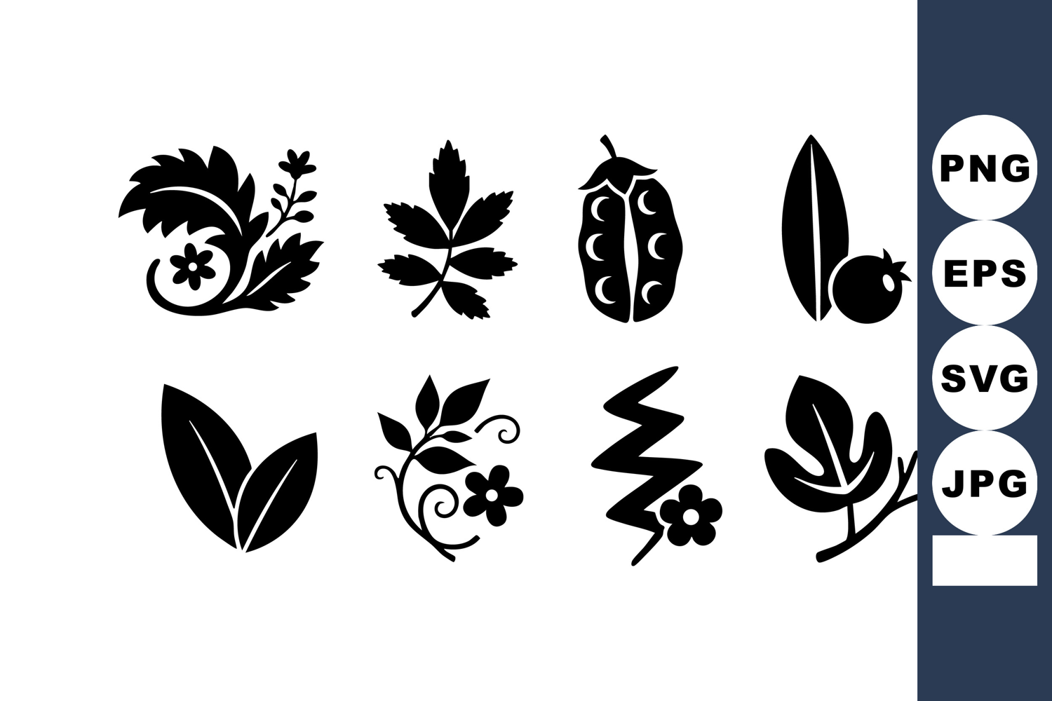 This vector features black botanical elements including leaves, flowers, and seeds in a simple silhouette style suitable for nature and design projects. Calm and elegant.