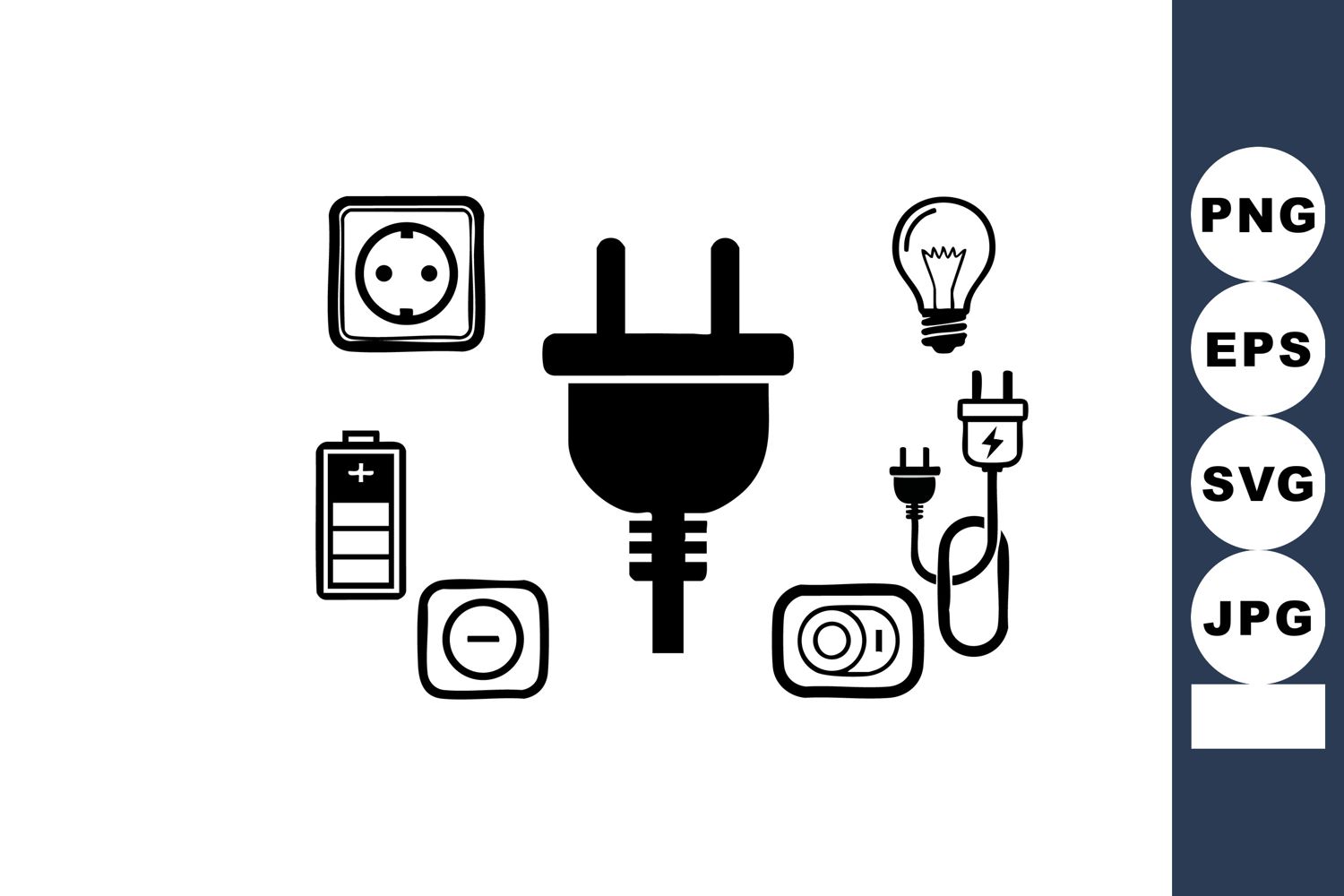 Vector shows electric power plug, wall sockets, battery, light bulb, and switch icons in black on white background, representing energy and electricity themes in simple style, clear and minimal, modern.