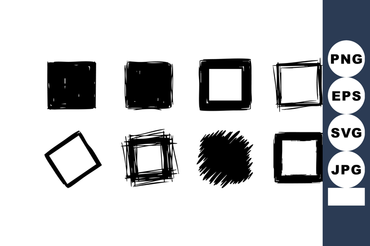This vector features eight black grunge square shapes and frames in various distressed styles, perfect for creative design projects and decorations. The mood is artistic and edgy.