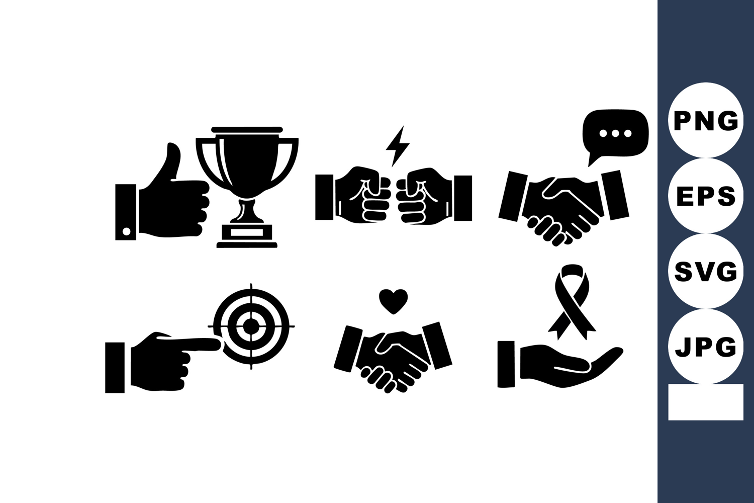 This vector file shows business icons including handshake, trophy, thumbs up, target, and awareness ribbon. It represents teamwork, success, partnership, and motivation in a clear style. Professional and positive mood.