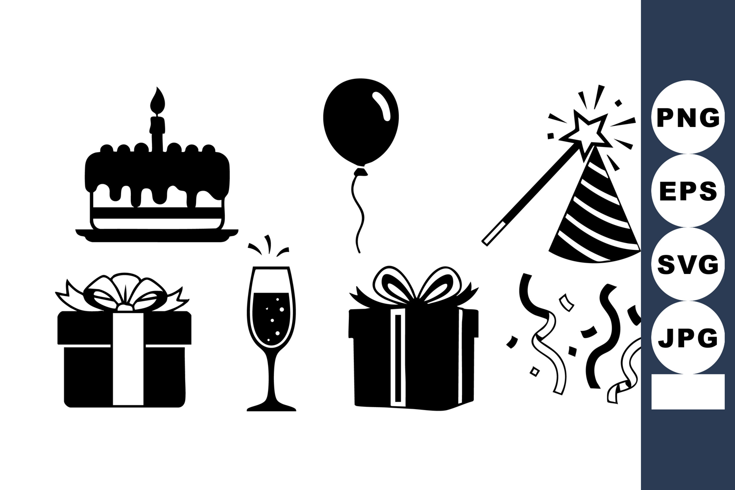 Vector image features birthday cake with candle, balloon, wrapped gifts, champagne glass, party hat, and confetti. Black and white party theme, festive and cheerful mood.