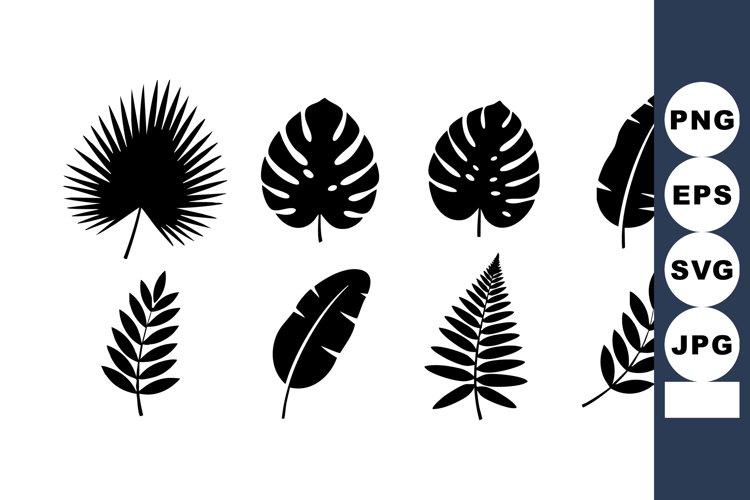 This vector file shows black silhouettes of various tropical leaves including palm, monstera, and fern shapes arranged neatly on a white background. It conveys a natural, minimalist mood.