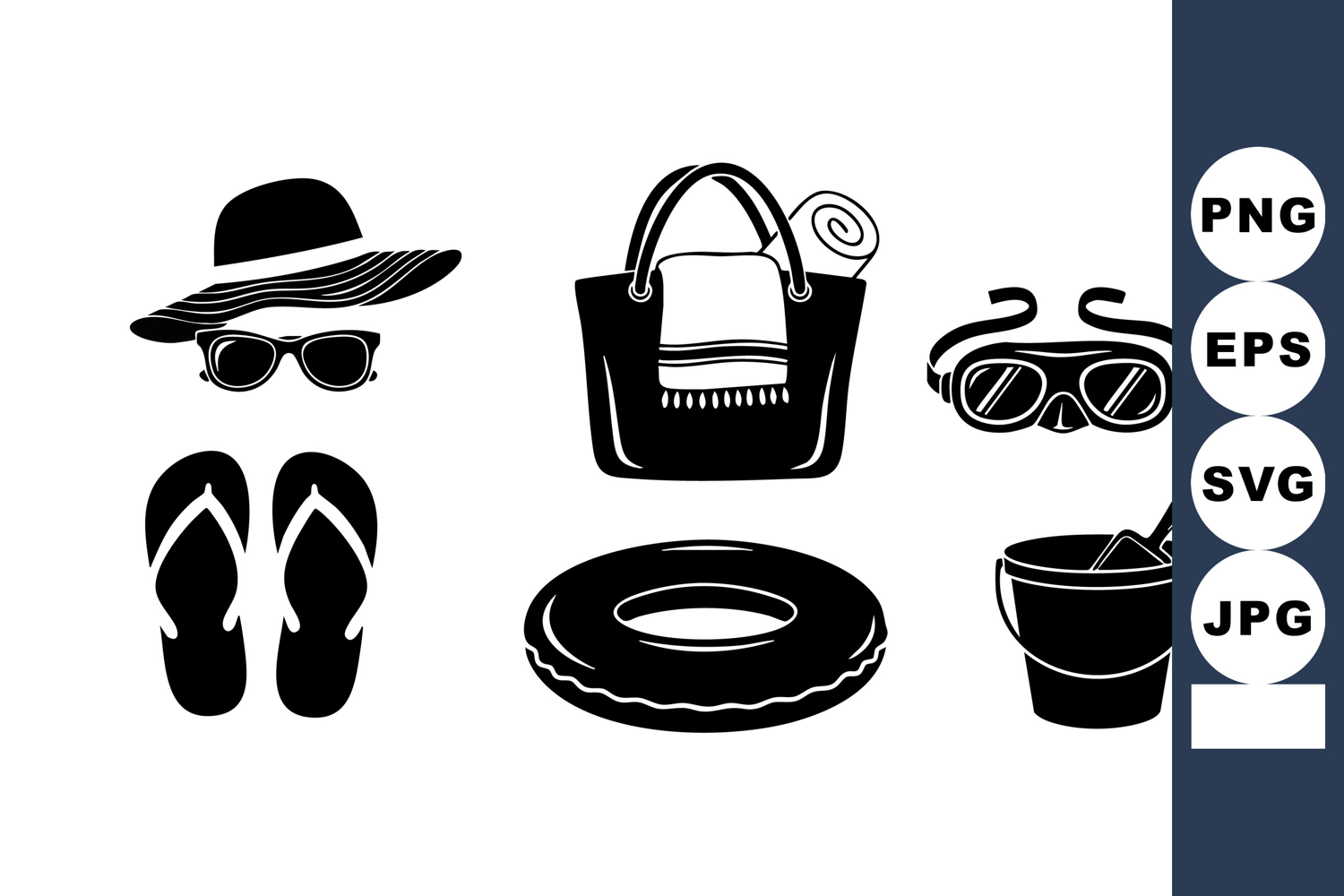 Vector shows black silhouettes of summer beach accessories including hat, sunglasses, flip flops, bag, float, bucket, and goggles creating a relaxed vacation vibe. Cheerful.