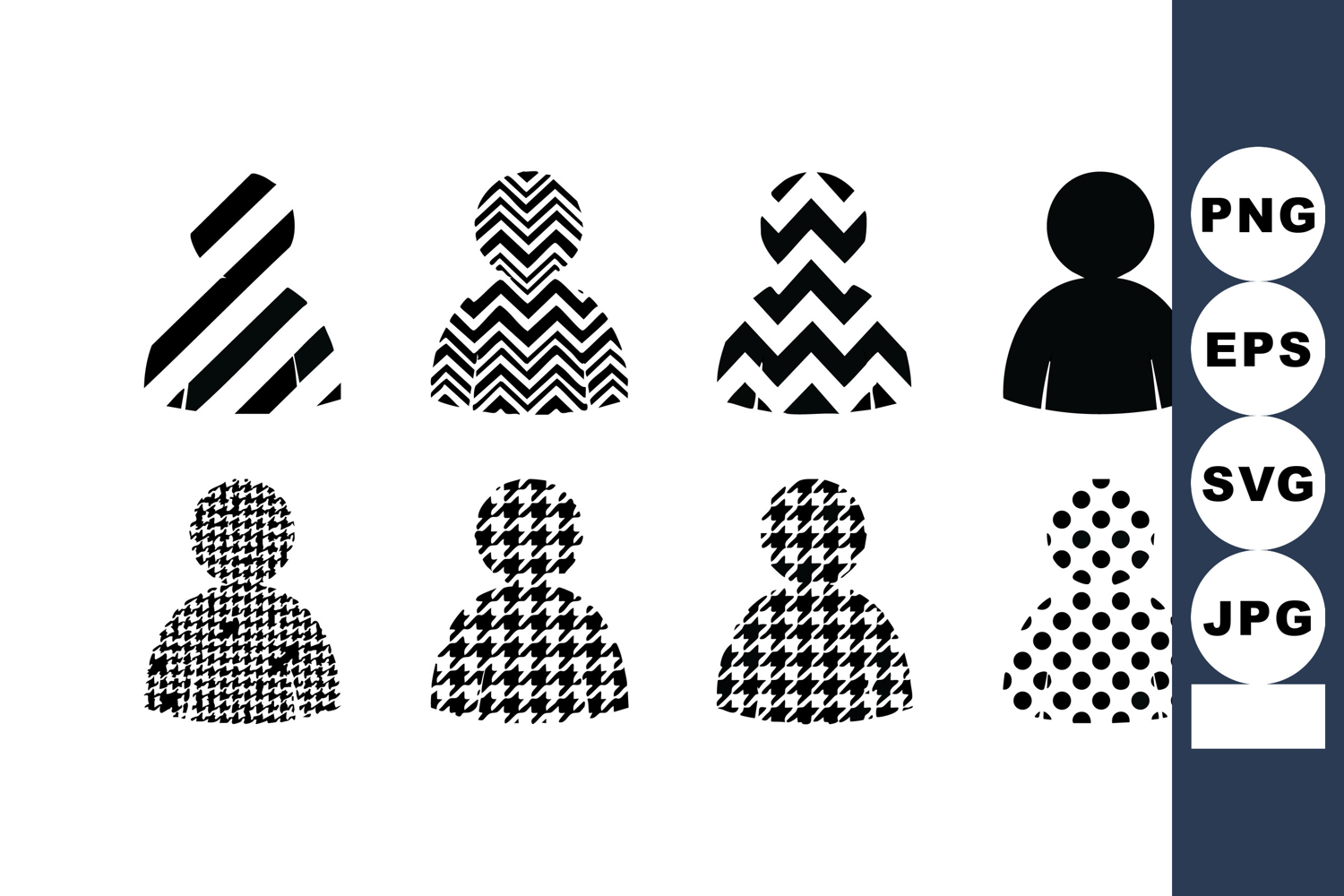 This vector file presents eight black and white human silhouettes featuring different geometric patterns, ideal for creative and modern design work, with a minimalist and stylish mood.