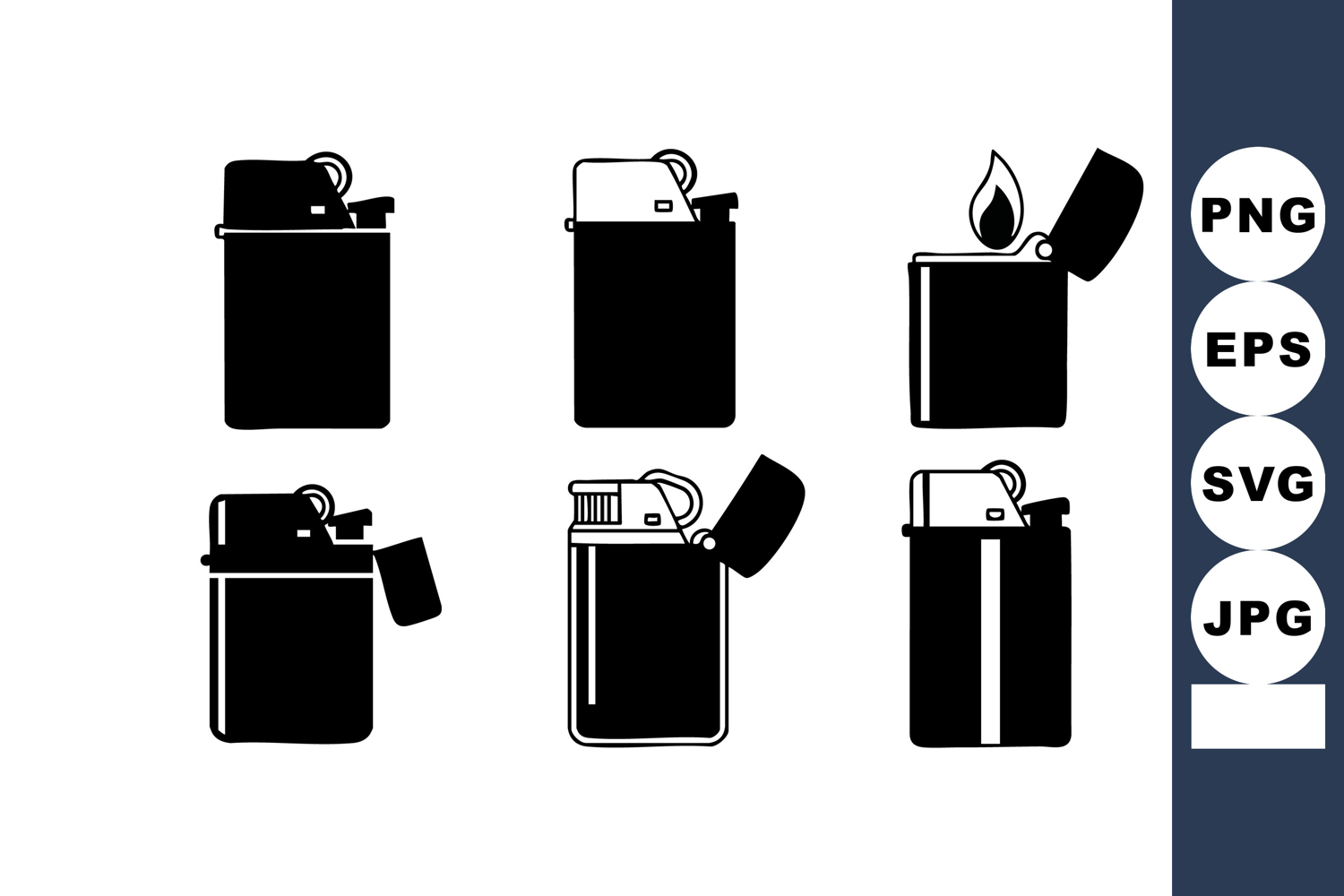 Vector image showing six classic metal cigarette lighters in different open and closed positions, emphasizing design and functionality, minimalistic black and white style, clean and simple mood.
