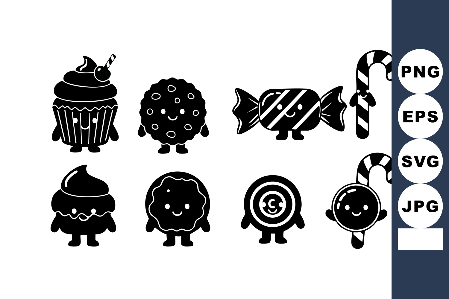 This vector features black silhouette candy and cupcake icons in simple sweet treat designs, perfect for decoration and design projects, presenting a playful and charming mood.