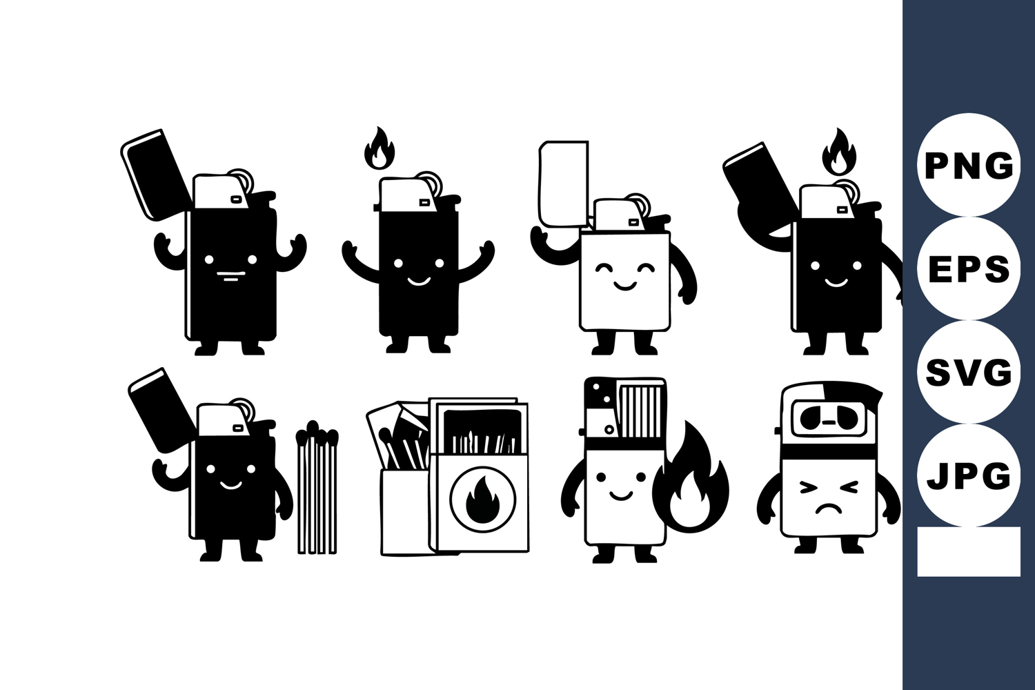 This vector features cute cartoon lighters with expressive faces and fire flames in black and white style, showing playful and happy mood.