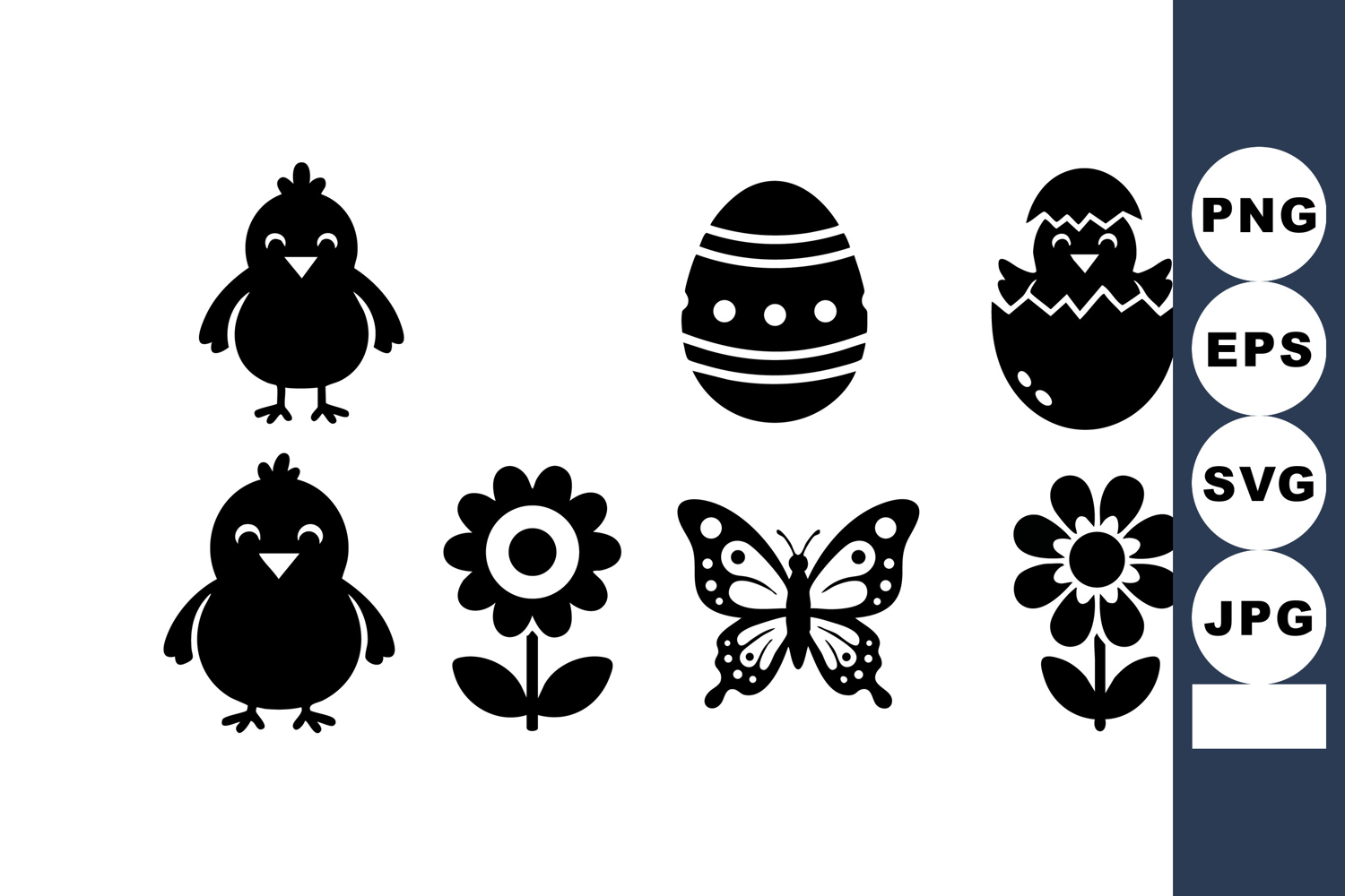 This vector features black silhouettes of Easter chicks, decorated eggs, butterfly, and flowers representing spring and holiday themes with a cheerful, festive mood.