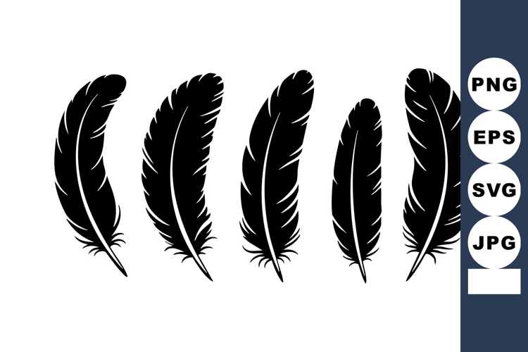 This vector file presents six black feathers arranged in a row with intricate details and smooth curves on a white background, ideal for creative design and decorative use. Calm and elegant.
