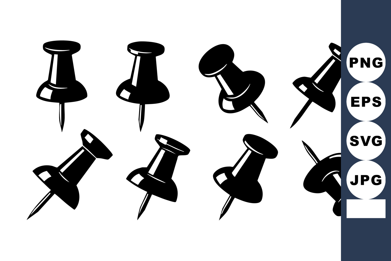 Vector image showing a collection of black push pins with various angles and subtle shadows creating a realistic effect. Simple, clear, and professional mood.