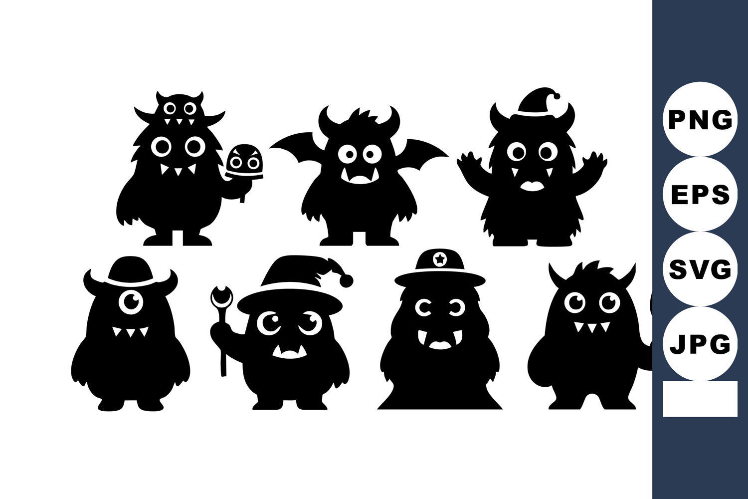 This vector shows a collection of cute Halloween monsters with horns, hats, and spooky expressions in silhouette style. The design evokes fun and eerie mood.