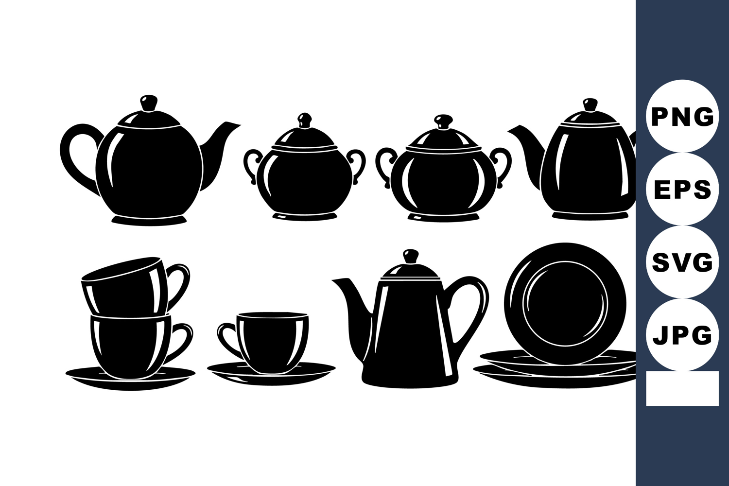 of classic vintage teapots and cups in black silhouette style, perfect for kitchenware and dining decor designs. Simple and elegant vector art, timeless and stylish mood.