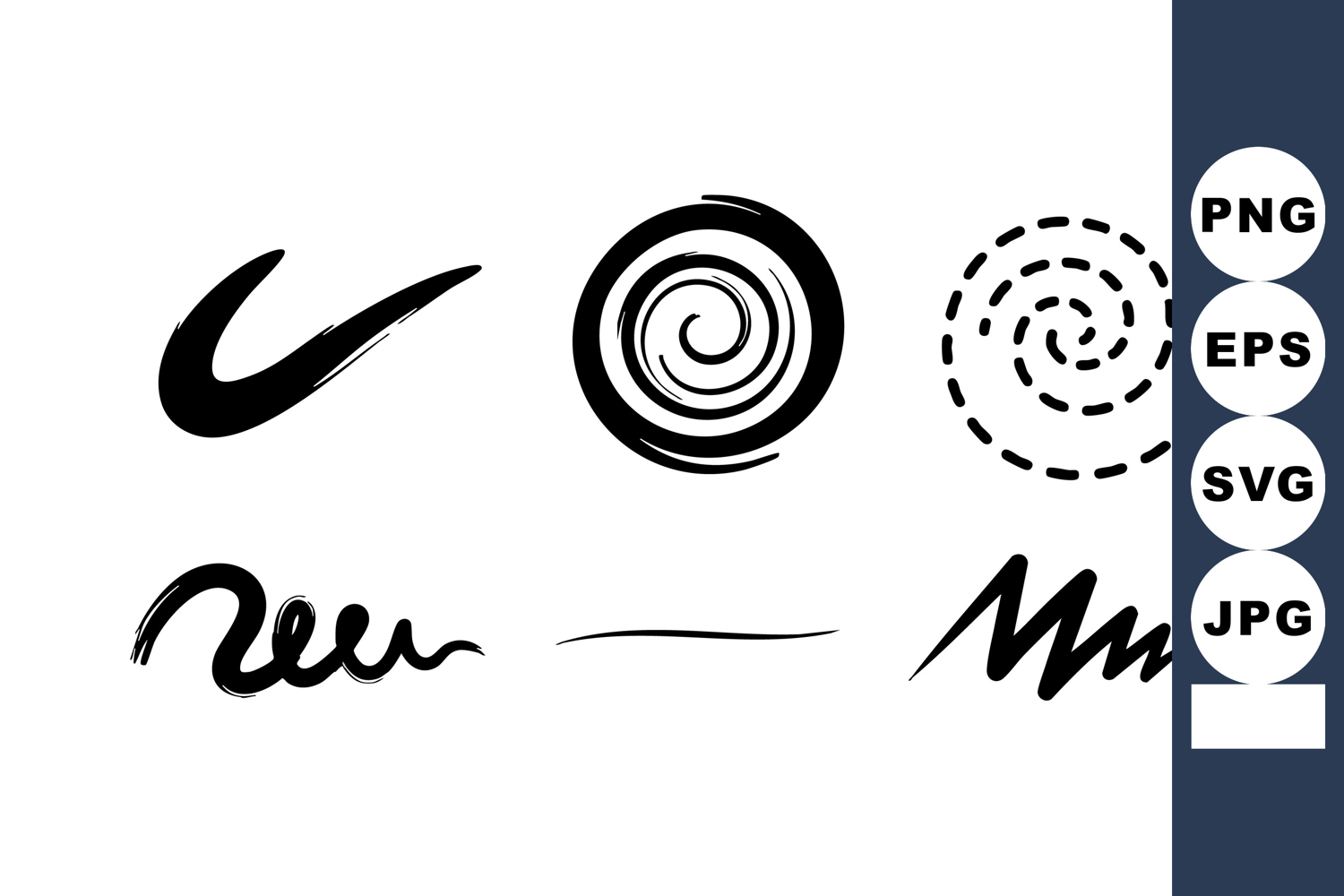 This vector features six black ink brush strokes and swirl shapes with varied textures and styles, suitable for creative and artistic design projects, offering a dynamic and bold mood.