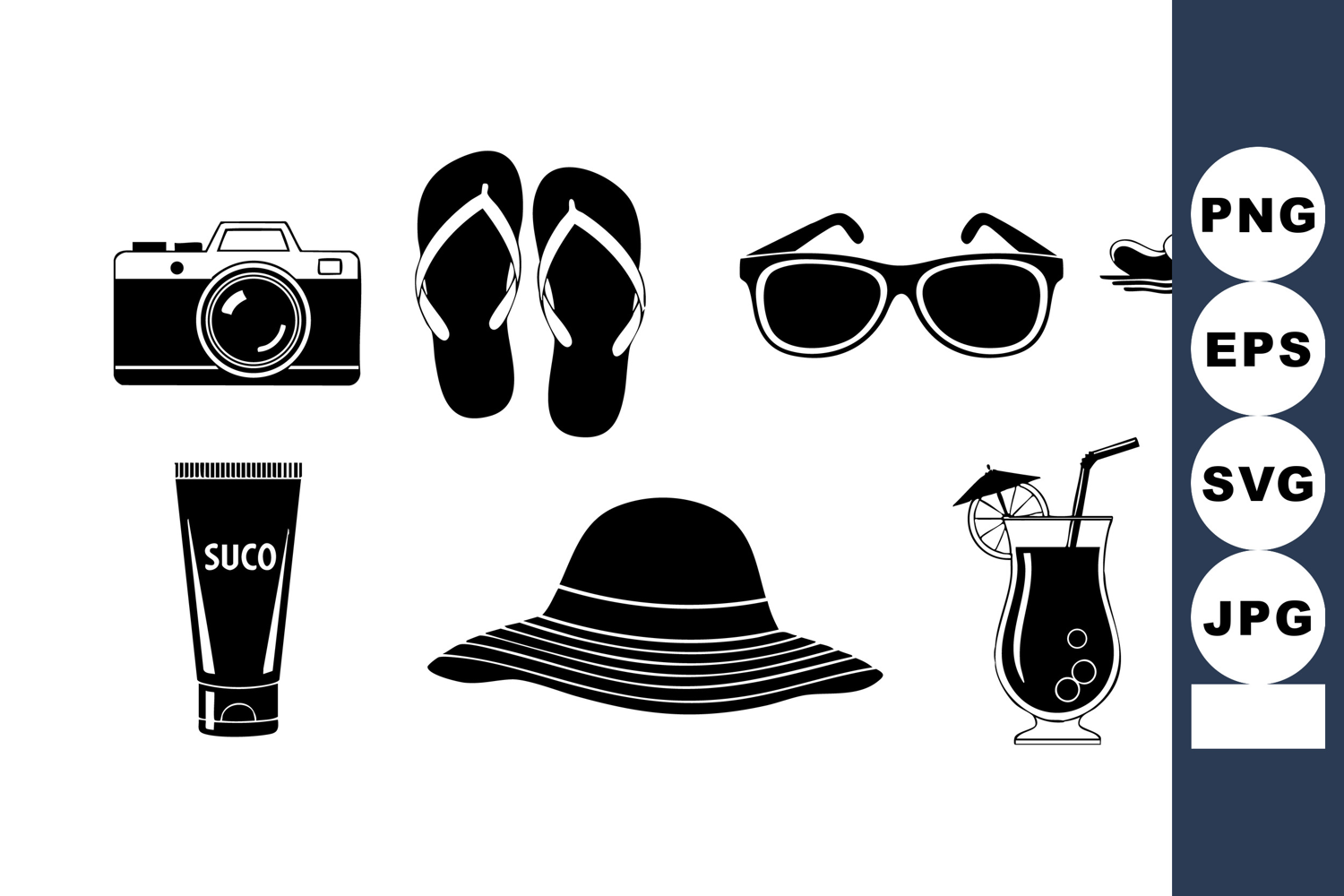 Vector icons showcase summer vacation essentials like camera, sunglasses, flip flops, sun hat, sunscreen, and tropical cocktail. Perfect for travel, leisure, and sunny beach themes. Bright mood.