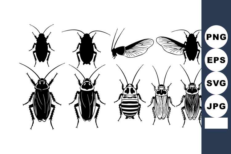 This vector features black silhouette cockroach illustrations displaying various angles and wing positions, emphasizing insect anatomy and detail in a clean graphic style. Informative and precise mood.