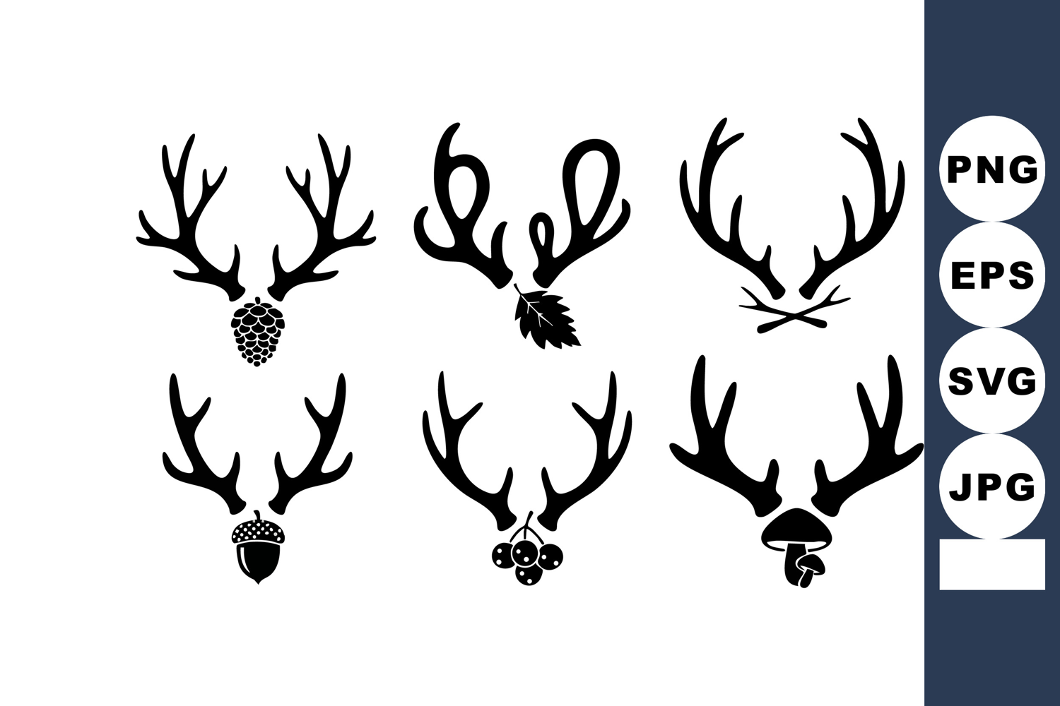 This vector illustration shows six black silhouette deer antlers combined with pine cones, acorns, leaves, and mushrooms in a minimalist style. The design is rustic and nature-inspired. Calm and organic mood.