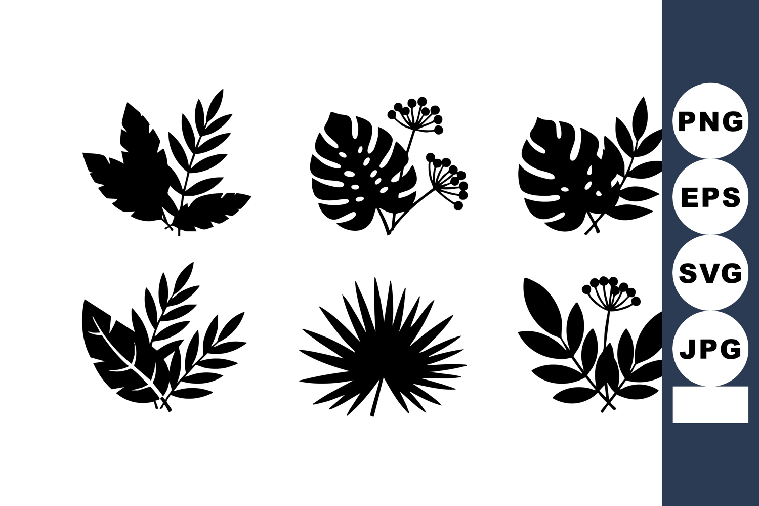 This image shows six black tropical leaves silhouettes including palms and monstera. The vector style emphasizes clean shapes and sharp edges, ideal for design projects. Minimalist and elegant.