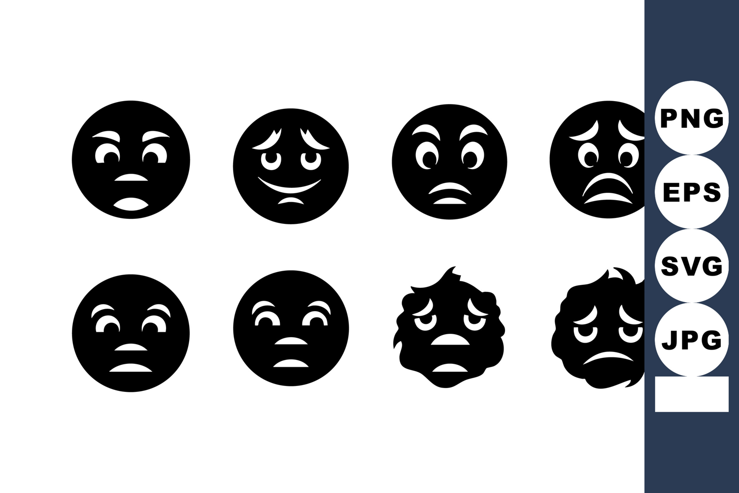This vector features sad black emoticons with different facial expressions, conveying emotions like disappointment, sadness, and worry in a simple black style, enhancing digital communication mood.